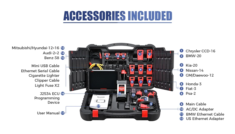 14 * OBDI адаптеры (Benz-14 (ЕС Версия MK908 PRO); Chrysler-16 (США Версия MK908 PRO); BMW-20; Kia-20; Nissan-14; GM/Daewoo-12;