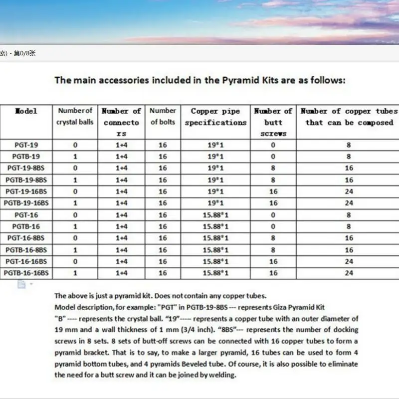Например, если вы хотите собрать пирамидку Giza (Пирамида для медитации с открытым каркасом)С основанием башни 1455,3 мм x 1455,3 мм и высотой башни 36 дюймов, Выберите первый ряд данных (первая группа), нужно только зайти в магазин аксессуаров и купить 4 медные трубки диаметром 19 мм,Каждый имеет толщину стенок 1 мм,Длина 1342,3 мм и 4 медных трубки диаметром 19 мм,Каждый имеет толщину стенок 1 мм,Длина 1262,6 мм,Затем соедините с комплектом пирамидки Giza, вы легко сможете им владеть.
