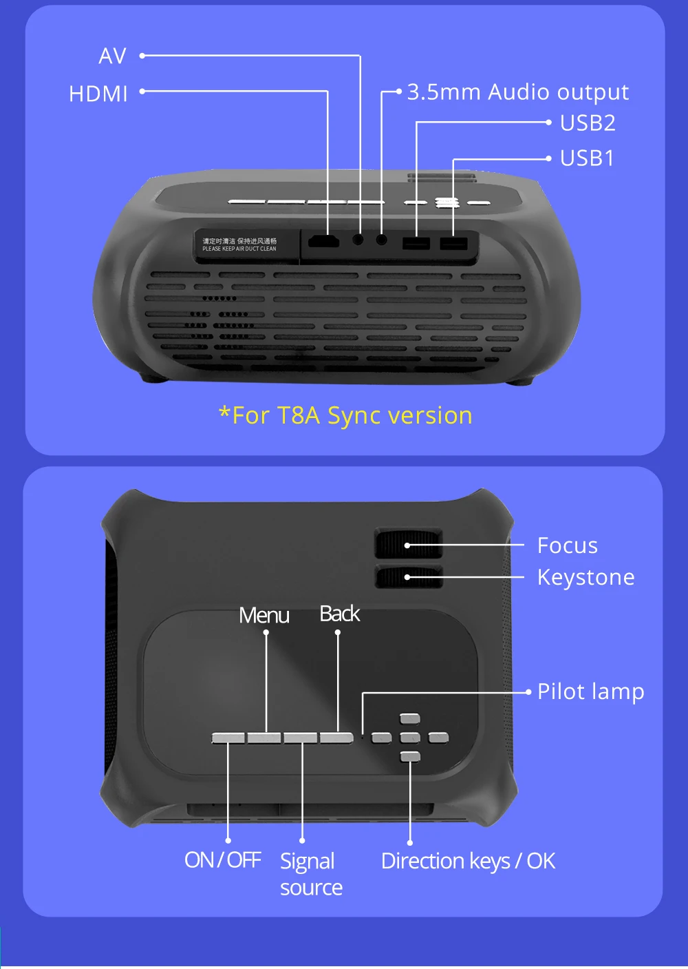 * 4000 люменов, выше, чем проекторы того же типа; * Родное разрешение 1280*720 точек/дюйм (RGB) * Поддержка беспроводного зеркального отображения экрана (только для T8A); * Встроенный Youtube, поддержка воспроизведения онлайн-видео (только для T8A); * Светодиодный источник света, может играть более 30000 часов (для нормального использования).