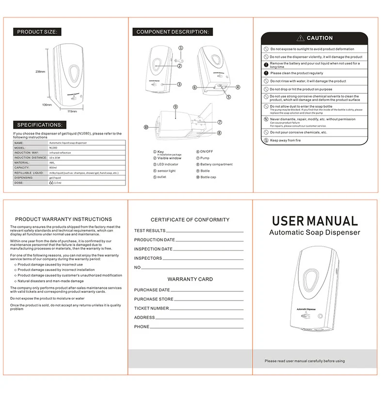 100% абсолютно новый и Премиальный! АБС-пластик прочный. Жидкость является фиксированным количеством, чтобы избежать отходов. Интеллектуальный инфракрасный датчик, дезинфекция не требует контакта. Дозатор мыла большой емкости 800 мл без частого пополнения. Для настенной установки вы можете выбрать перфорированную установку или не перфорированную установку. Может использоваться во многих местах, туалетах, кухнях, офисных помещениях, гостиницах, больницах, общественных местах и т. д.