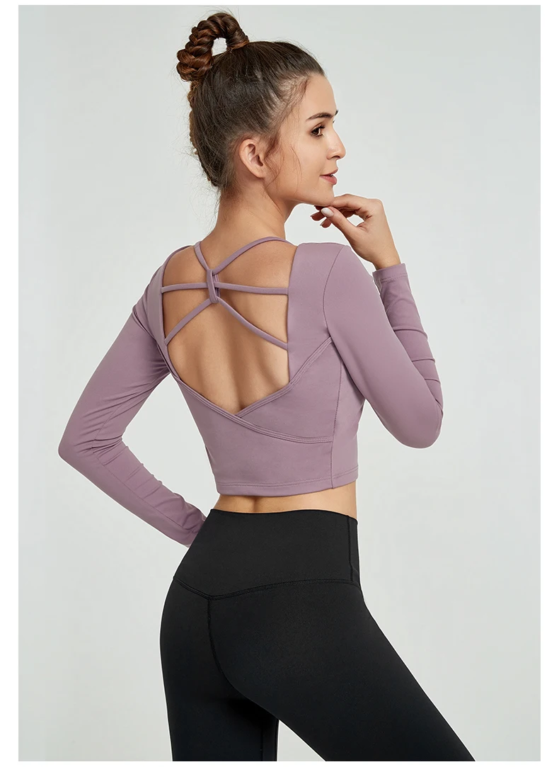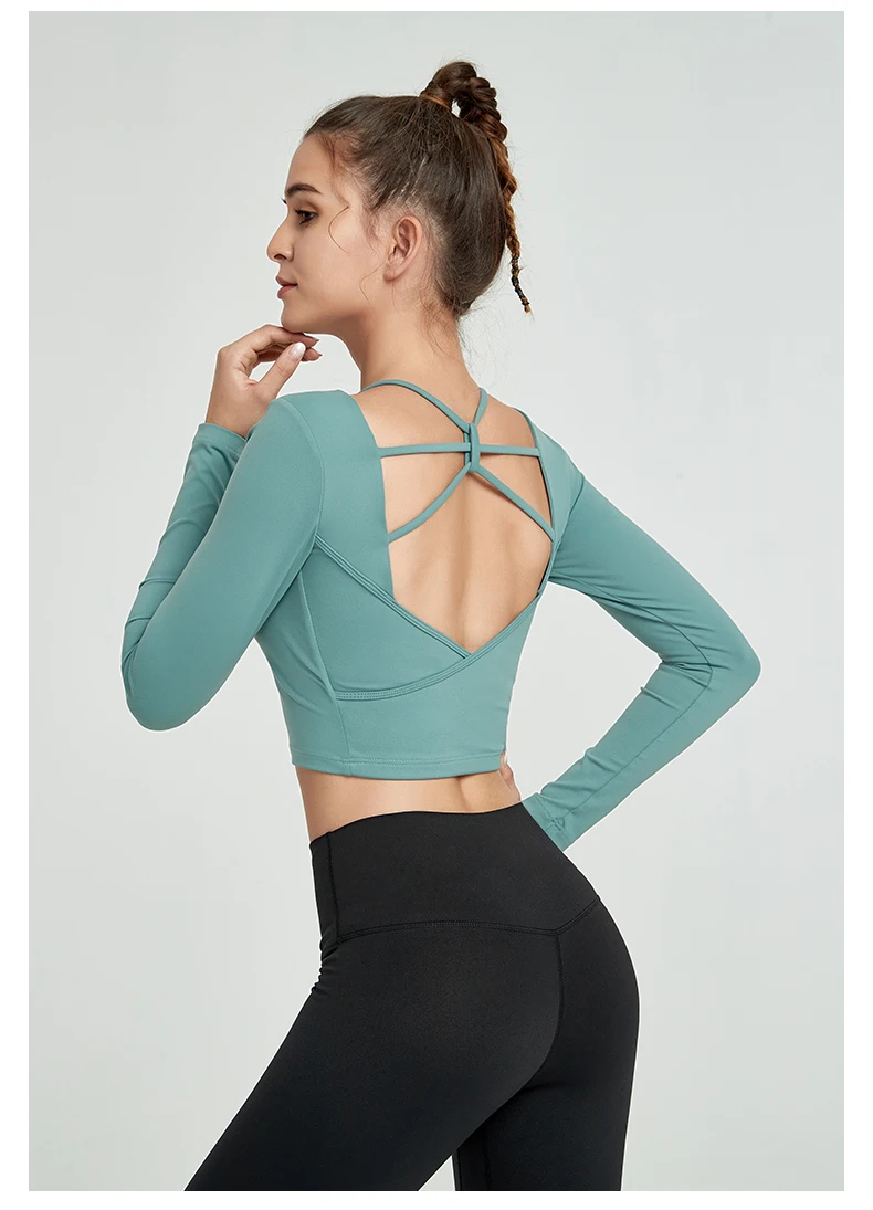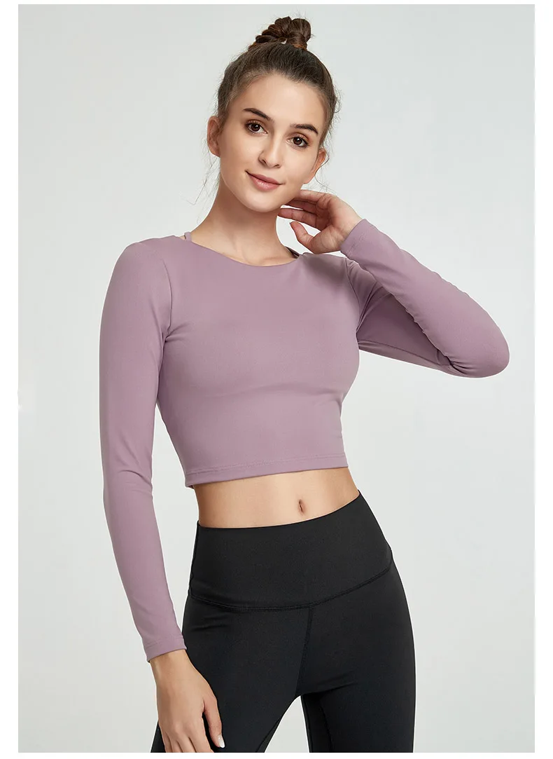 Женский топ для йоги со съемными подушечками, с длинным рукавом, женские топы для тренировок в тренажерном зале, очень эластичные футболки для фитнеса с открытой спиной, топы для занятий спортом, YJY20-1