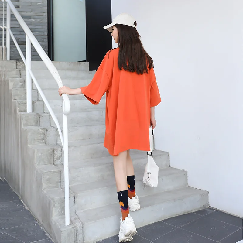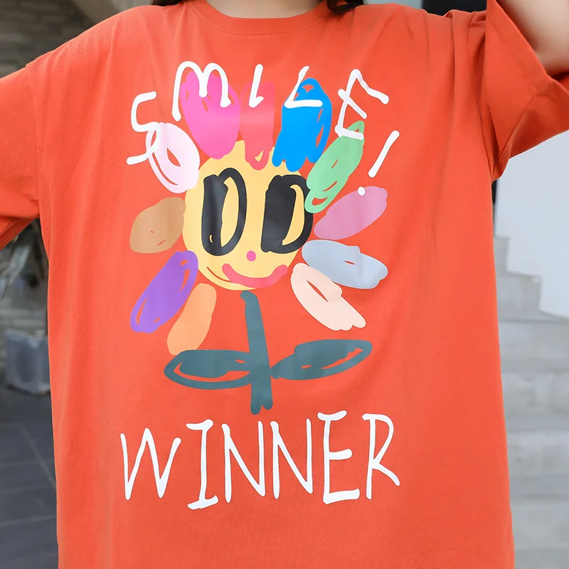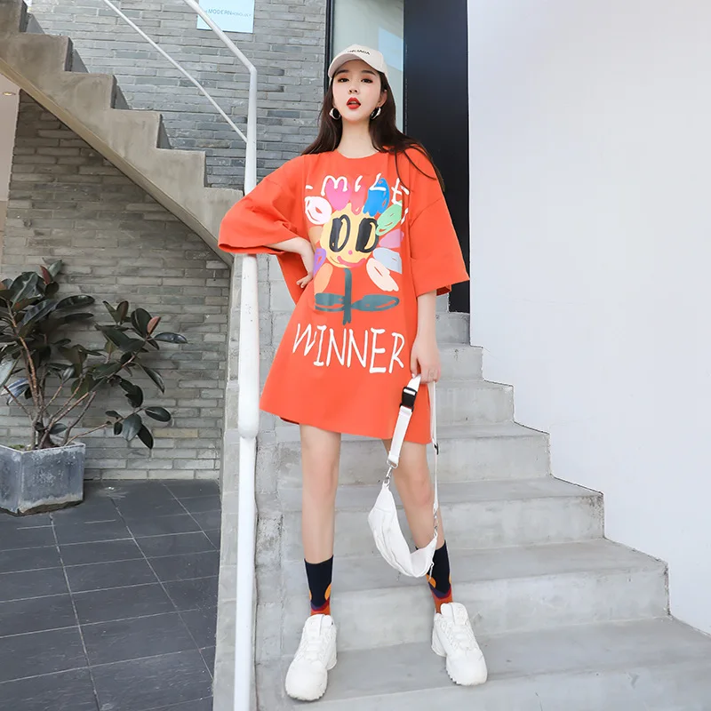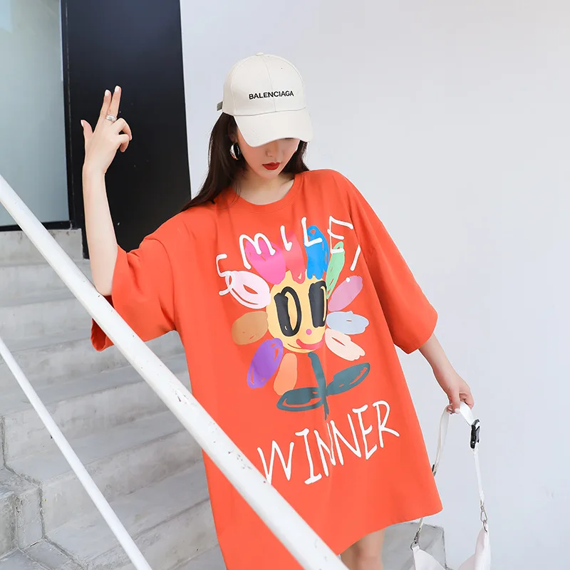 Женская футболка оверсайз в Корейском стиле, длинная оранжевая футболка с ярким принтом ромашки, Свободный Повседневный Простой Топ для девушек, лето 2020 Размер: один размер Размер Единица измерения: см Длина: 85, обхват груди: 138, рукав (от воротника до манжеты):46, манжета: 48