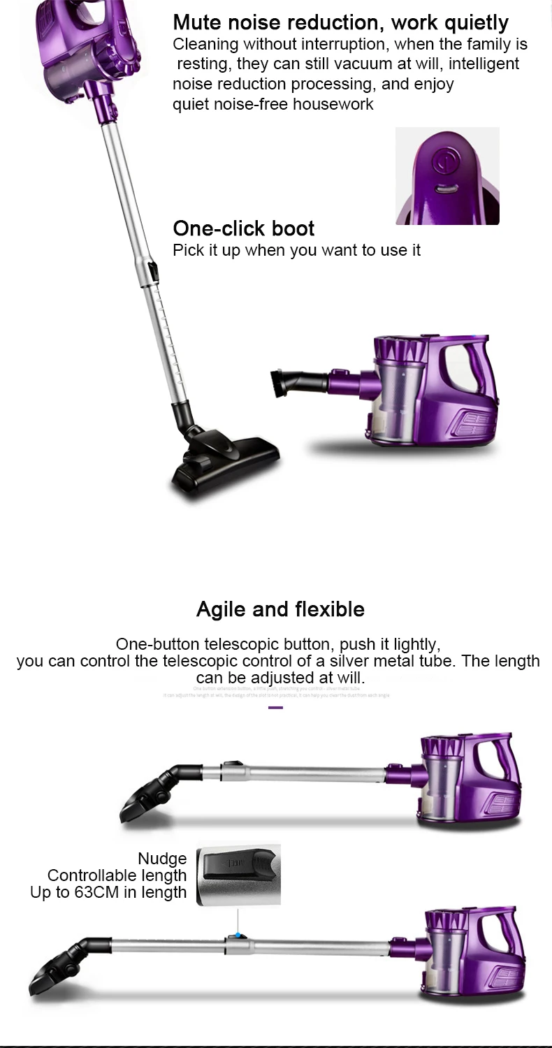 1: вертикальный ручной «Два в одном», запуск одной кнопкой, простой и легкий 2: Эргономичный изогнутый дизайн, гибкий и сменный 3: беспроводной вакуум, сильное всасывание 8000 Па 4: литиевого аккумулятора 2200 ХАМ хватает на 1 час работы 5: регулировка корпуса. Всесторонняя очистка на 360 ° 6: пылесборник большой емкости л, подходит для домашних транспортных средств