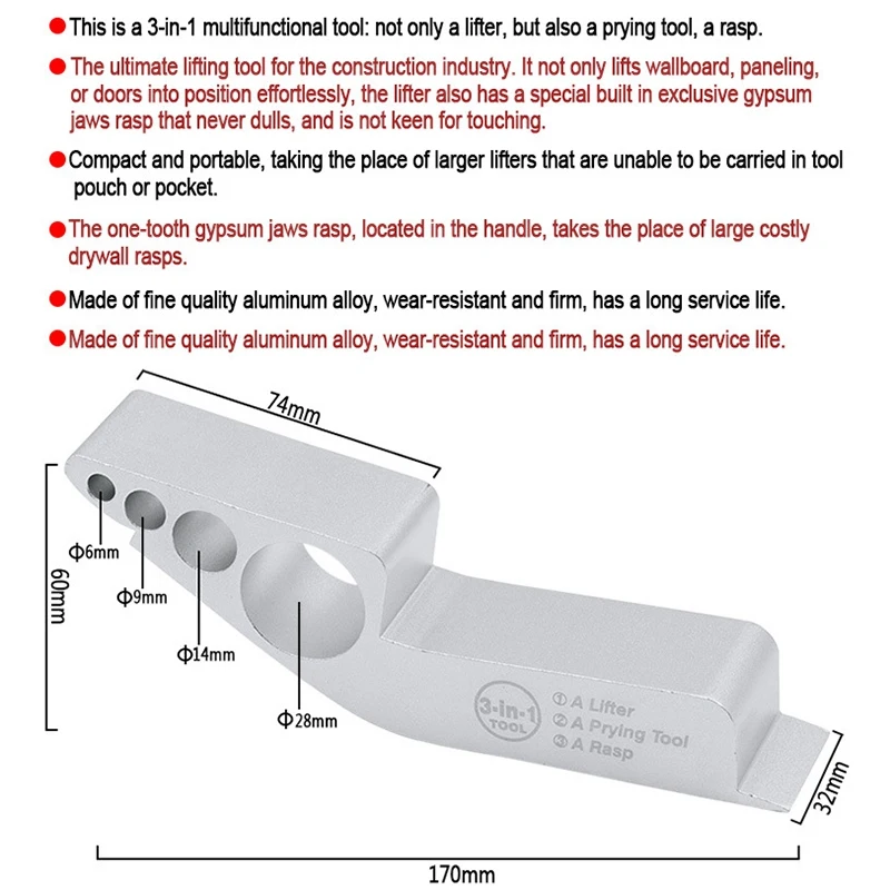 Конечный подъемный инструмент для строительной промышленности. Он не только легко поднимает стеновую доску, обшивку или двери в положение, подъемник также имеет специальный встроенный эксклюзивный шпатель из гипсокартона, который никогда не тускнеет и не тянется к прикосновениям.