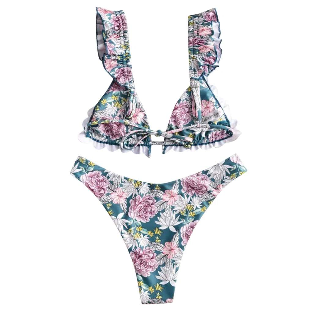 Женский купальник-бикини из двух частей с цветочным принтом и v-образным вырезом, пляжная одежда