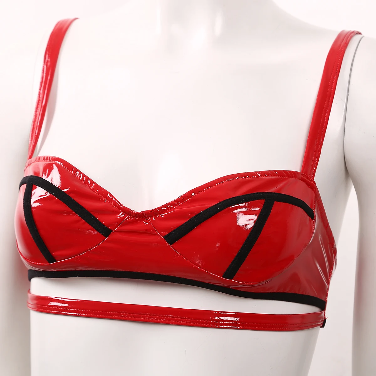Women’s wet look patent leather bra top lingerie, wire-free and unlined design.