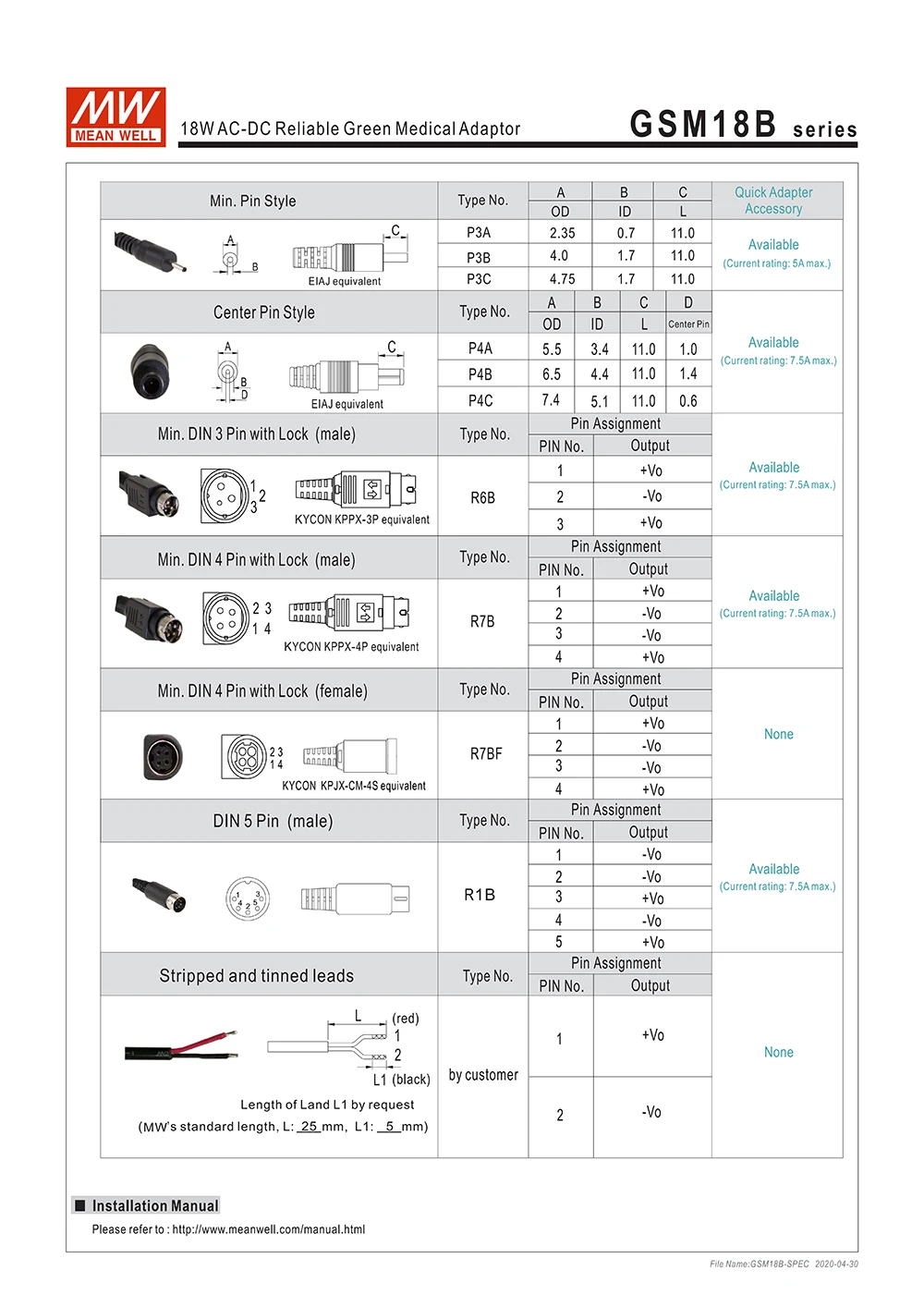 GSM18B-это высоконадежная, 18 Вт настольная серия зеленого медицинского адаптера с одним выходом. Этот продукт оснащен 2-контактным (без FG) стандартным IEC320-C8 входом переменного тока, принимающим входной диапазон от 80VAC до 264VAC. Вся серия поставляет различные модели с выходным напряжением между 5VDC и 48VDC, которые могут удовлетворить требования для различных типов медицинских электрических устройств. Схема соответствует международным медицинским стандартам (2 * MOPP), имеет сверхнизкий ток утечки (<50uA), установка медицинских устройств в непосредственном электрическом контакте с больными. С эффективностью до 88% и чрезвычайно низким энергопотреблением без нагрузки ниже 0,1 Вт, GSM18B совместим с США EISA 2007/DoE, Канадой NRCan, Австралией и Новой Зеландией MEPS, ЕС Erp и соответствует коду (CoC) версии 5; Функция supreme позволяет адаптеру экономить энергию, когда он находится в режиме работы или в режиме ожидания. Вся серия использует огнестойкий пластиковый чехол 94V-0, GSM18B сертифицирован с международными правилами медицинской безопасности.