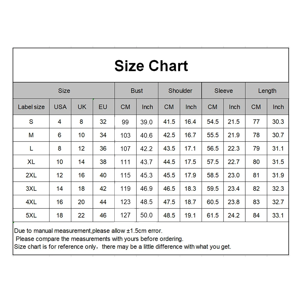 [Наш Размер 5XL] Бюст: 63,5 см/25,00 дюйма, длина: 84 см/33,07 дюйма, рукав: 61,5 см/24,21 дюйма, Плечи: 48,5 см/19,09 дюйма (прибл.)