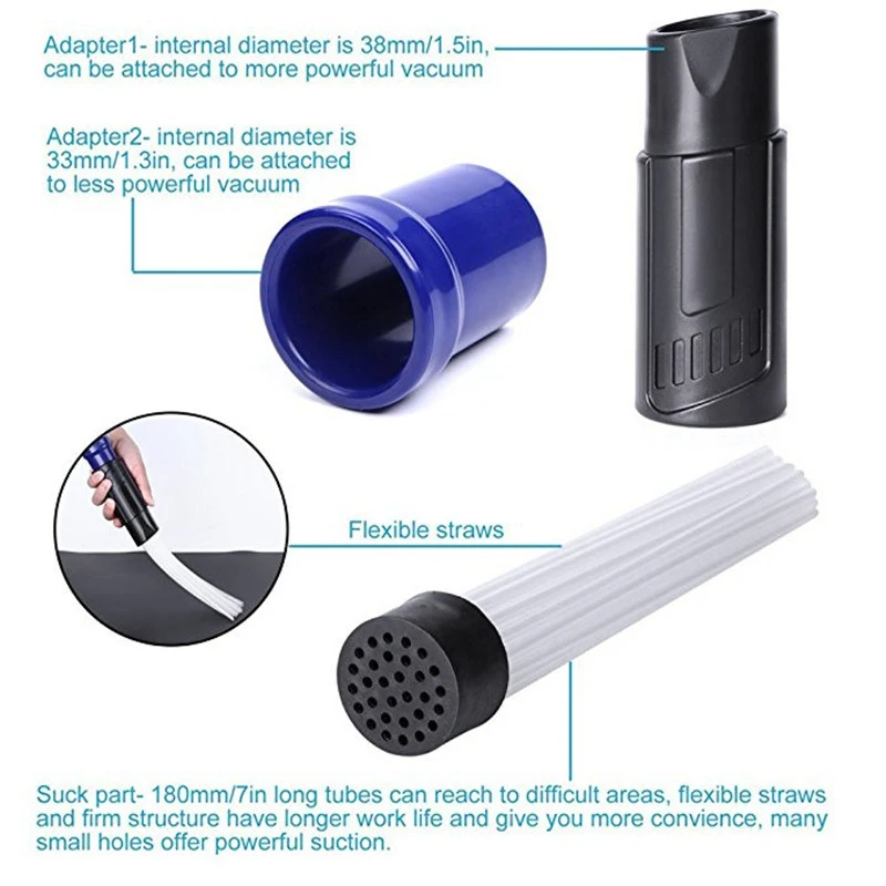 Он также поставляется с универсальным адаптером, чтобы он мог подключаться к любому вакууму. Десятки гибких, крошечных всасывающих трубок, которые могут идти практически в любом месте от пыли. Пыль вокруг крошечных предметов, не снимая их в первую очередь. Сочетает в себе лучшее из пыли и вакуума. Идеально подходит для очистки хрупких предметов! Избавьтесь от пыли, до которой Вы не могли добраться, отлично подходит для вентиляционных отверстий, клавиатуры, ящиков, жалюзи, мебели, автомобилей и многого другого. Это лучший инструмент для очистки.
