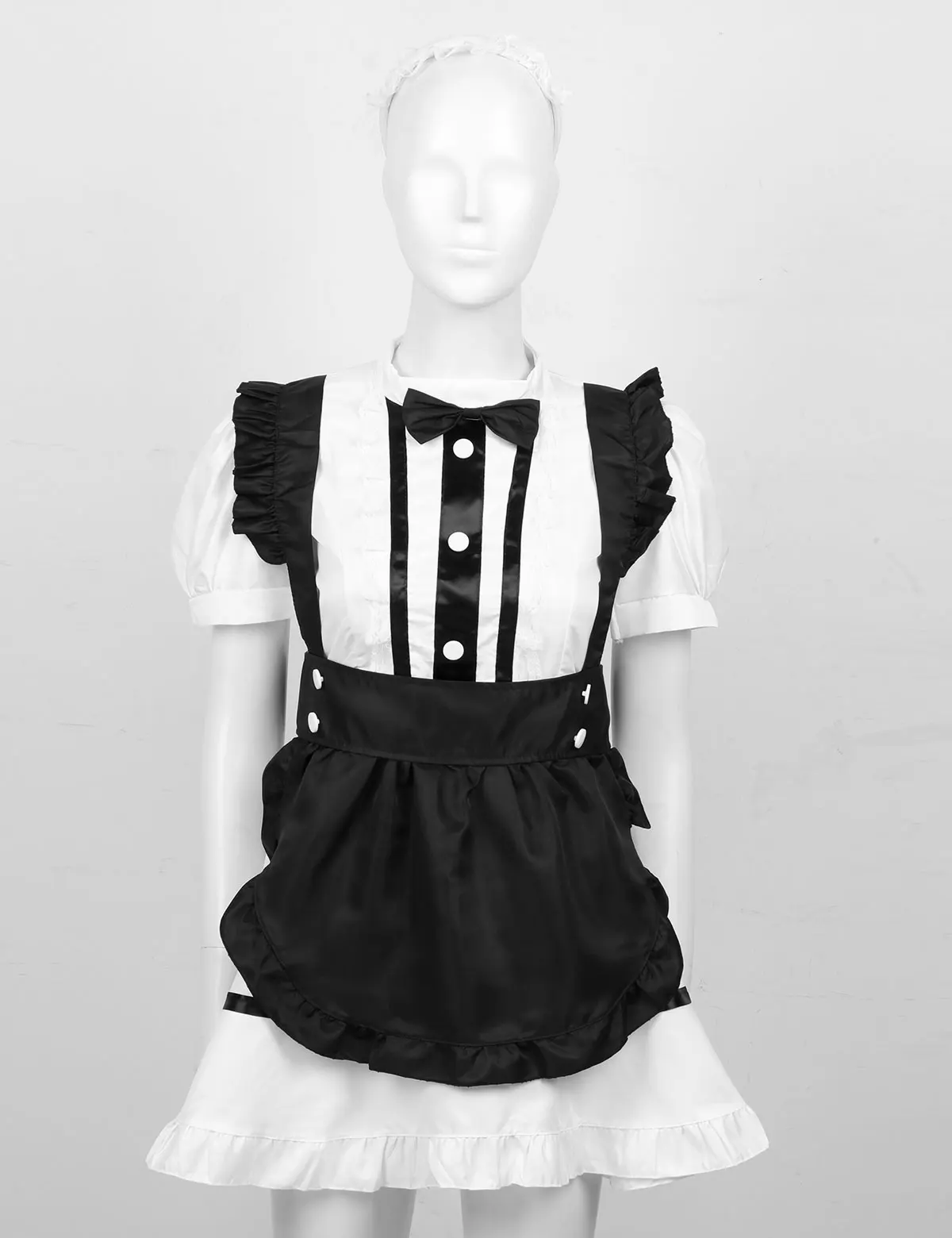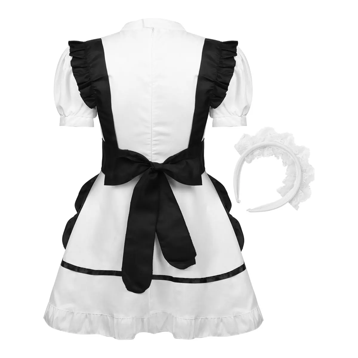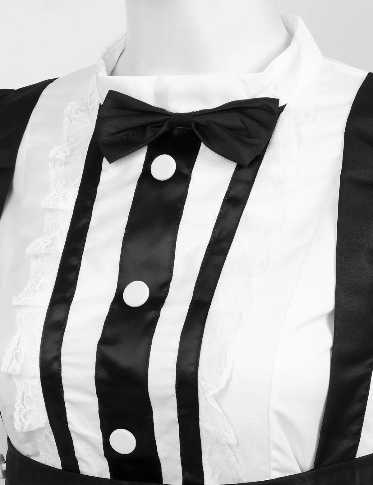 Классическое платье японской горничной, с круглым вырезом и короткими пышными рукавами, длиной до колена и трапециевидной формы, скрытая застежка-молния сзади.