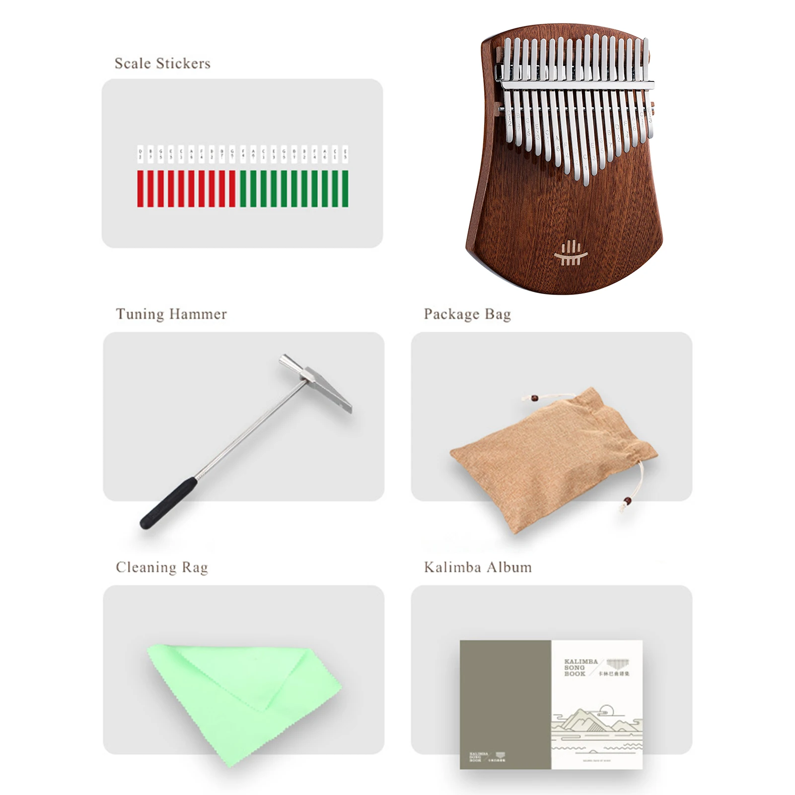 Полный аксессуаров: посылка поставляется с калимбой, тюнинговым молотком, салфеткой для чистки, записью песен, сумкой для хранения и стикером для музыкальных нот.
