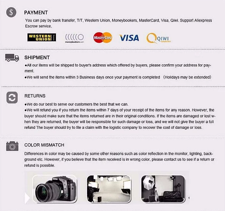 Пожалуйста, внимательно проверьте таблицу размеров. Из-за различных партий производства, может быть отклонение 2 ~ 3 см, это нормальное состояние.